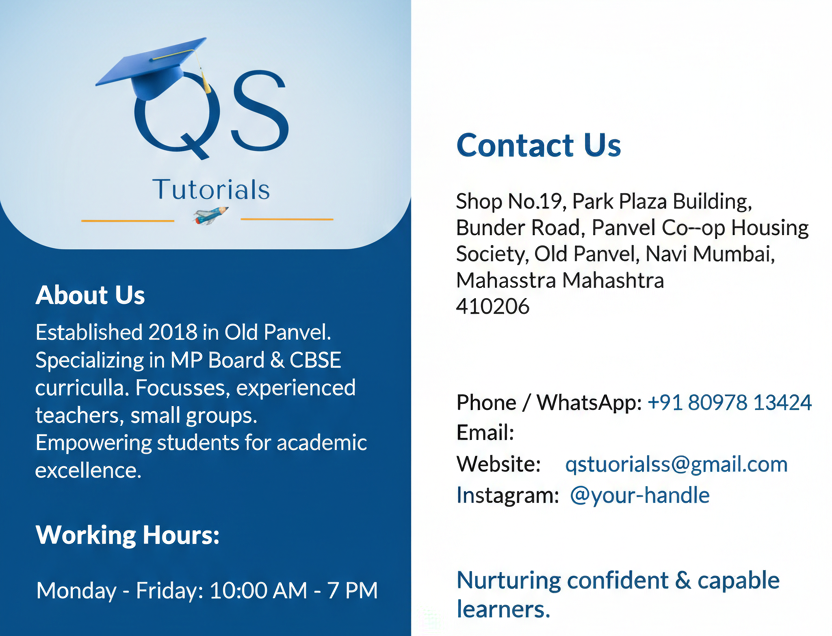Welcome to QS Tutorials, a trusted coaching and tuition center dedicated to academic excellence in Panvel, Maharashtra. Established in 2018, QS Tutorials was founded with a clear vision—to provide quality education, strong fundamentals, and personalized guidance to school students in a supportive learning environment.